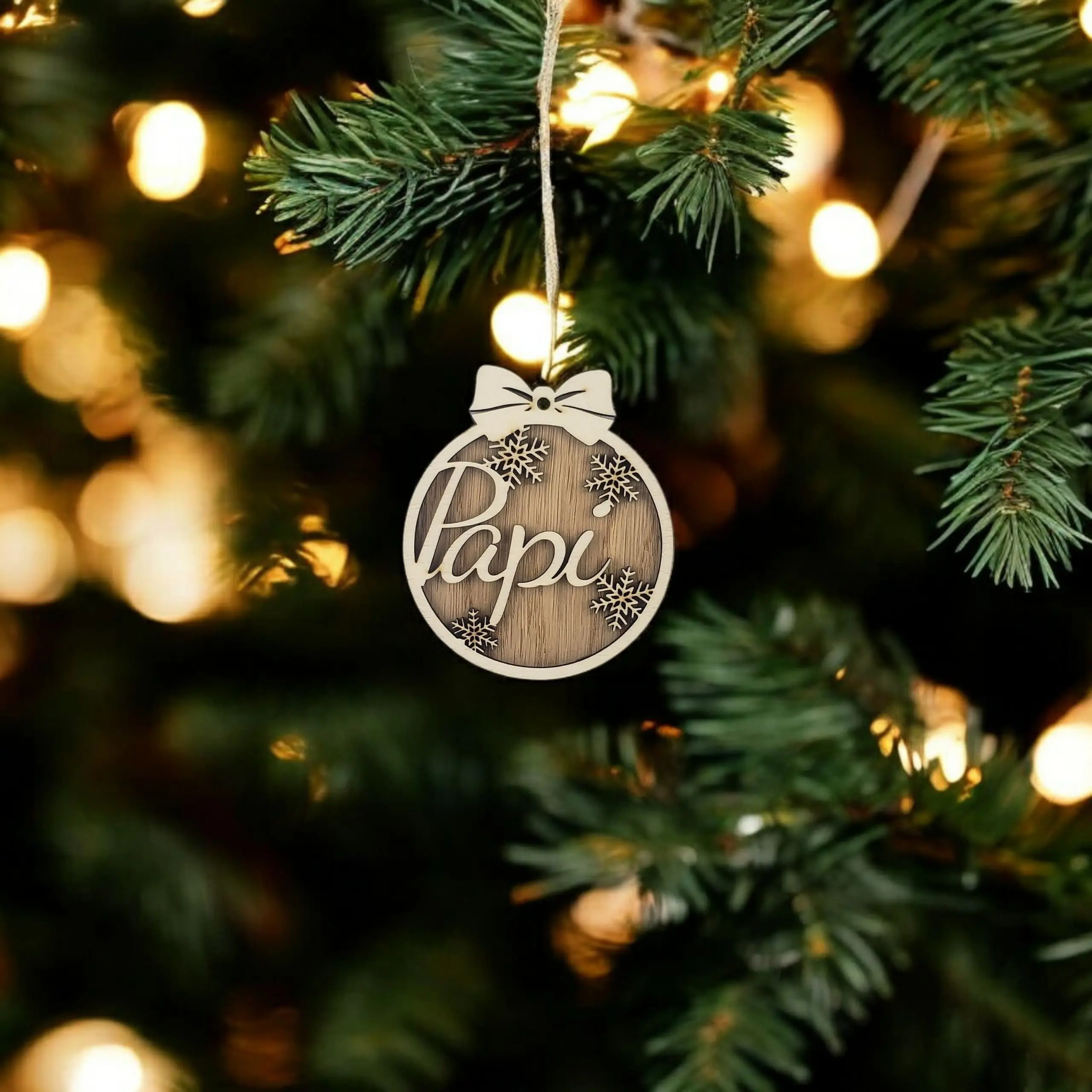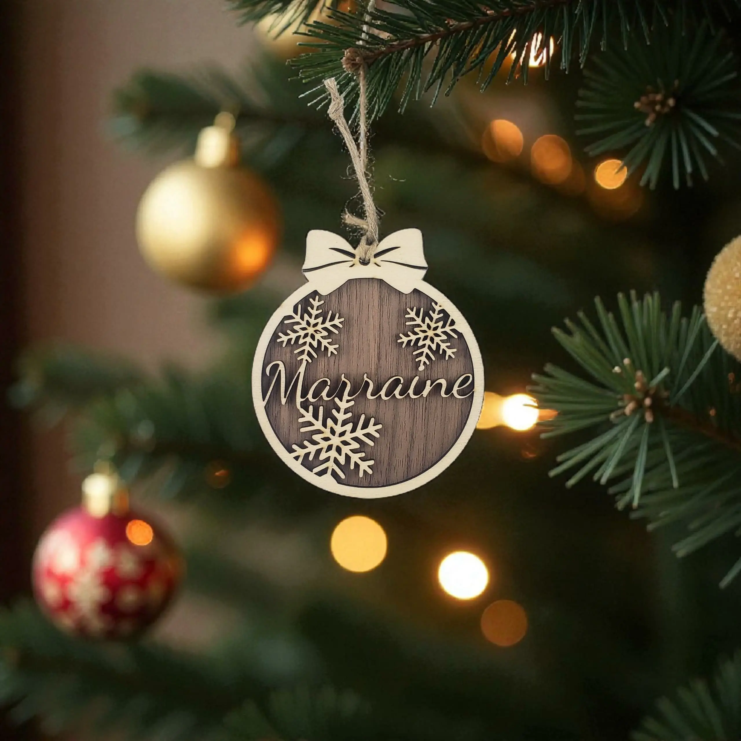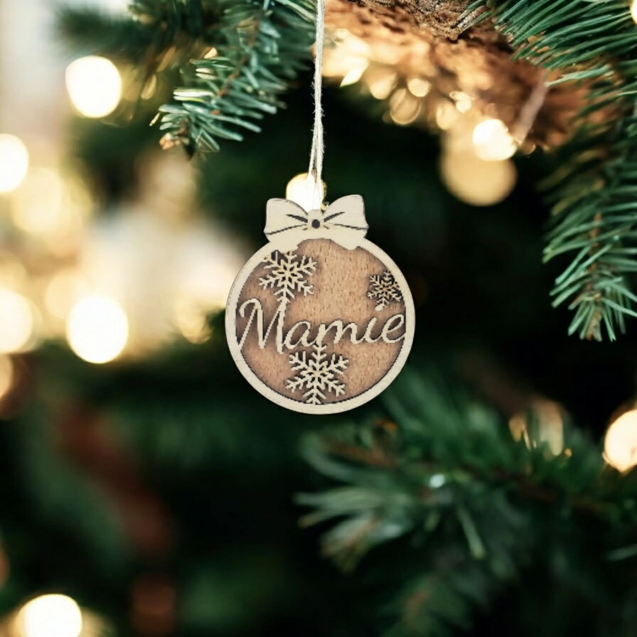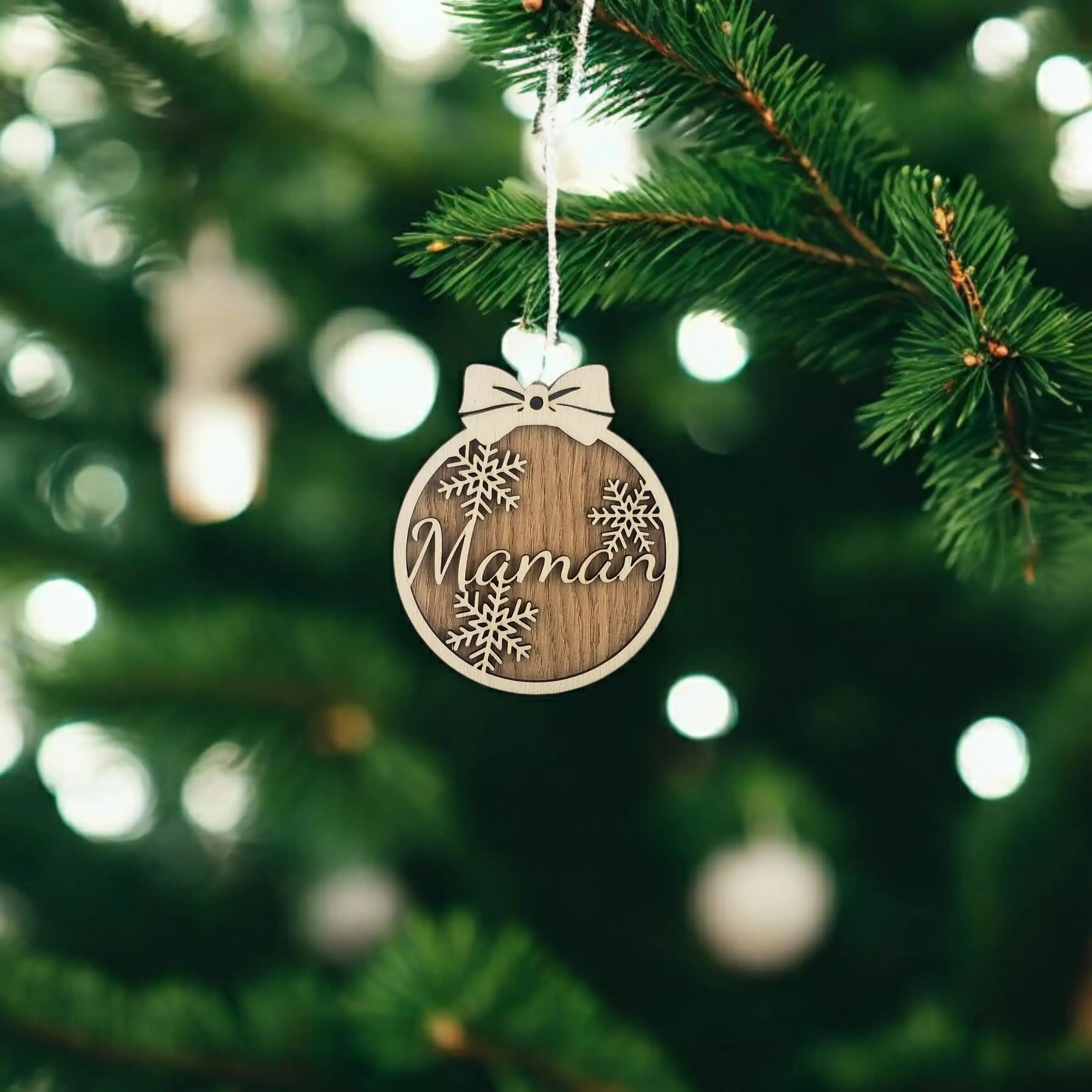 Chaque boule est gravée avec le prénom de votre choix, délicatement relié à de petits flocons de neige pour un rendu fin et poétique.