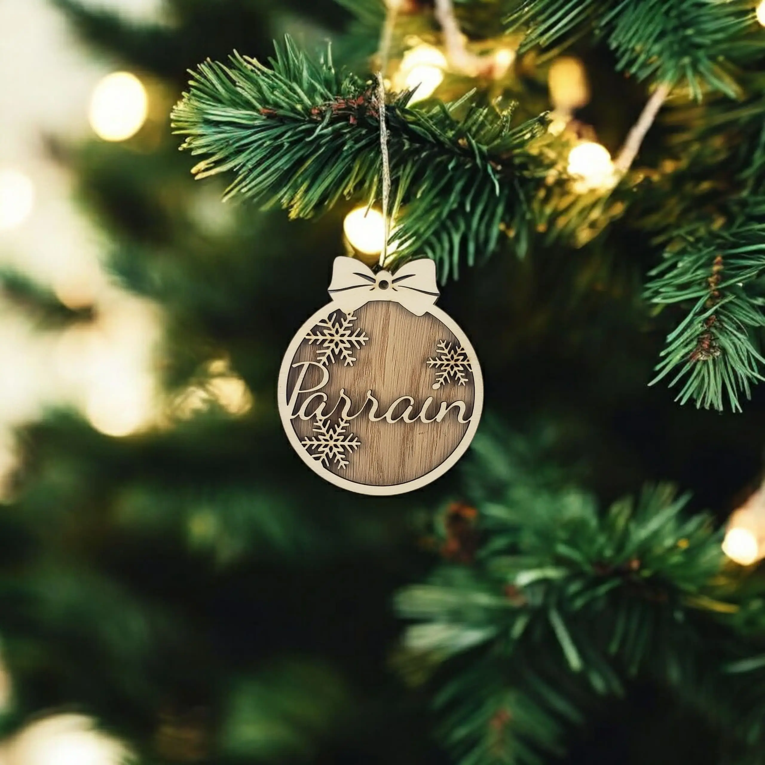 Le prénom apparaît sur les deux faces, permettant une belle visibilité quel que soit l’angle sous lequel la boule est suspendue. Au centre, vous pouvez choisir entre un plaquage en chêne, noyer ou hêtre, trois essences nobles qui apportent chacune leur propre charme naturel.